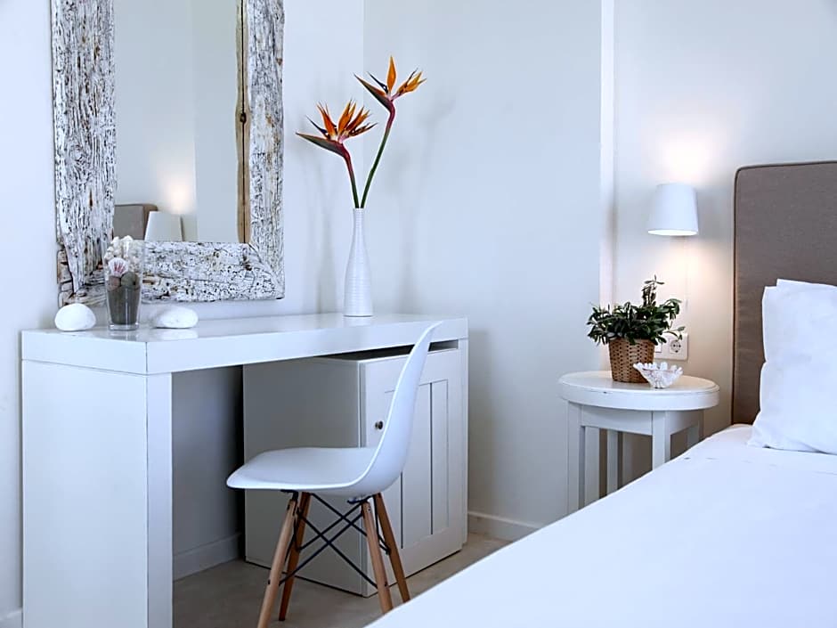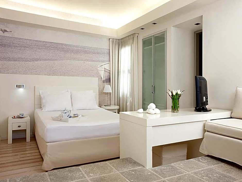 Enjoying Aegean Sea view from its balcony or terrace, this room is elegantly decorated in white tones. It features: